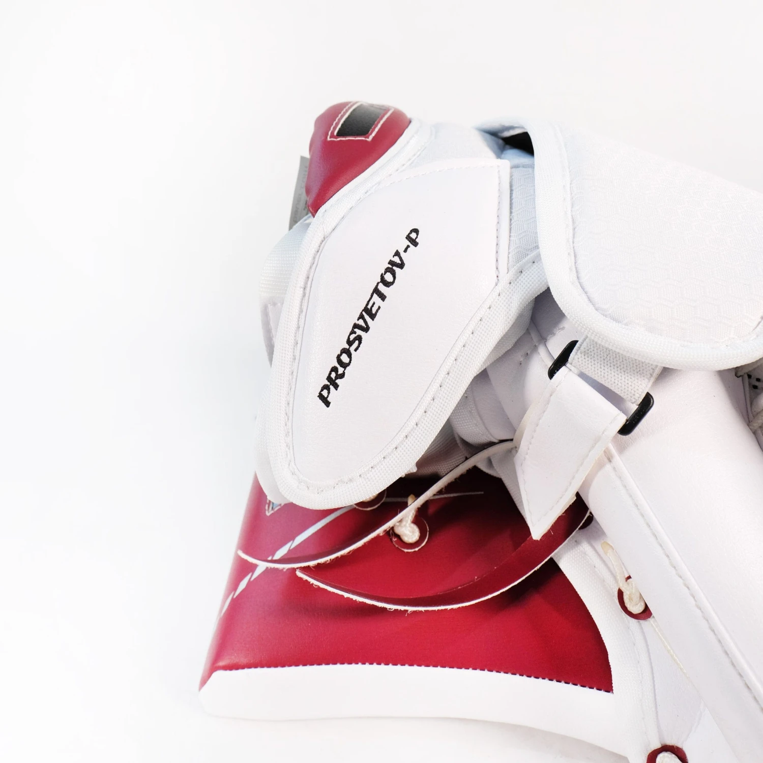 This custom Bauer Vapor Hyperlite goalie set is a pro return from NHL and AHL goalie Ivan Prosvetov. This is a full set including leg pads, catcher, and blocker and has been outfitted with Prosvetov’s specs and preferences, including various custom features, custom construction, and Arizona Coyotes graphics.