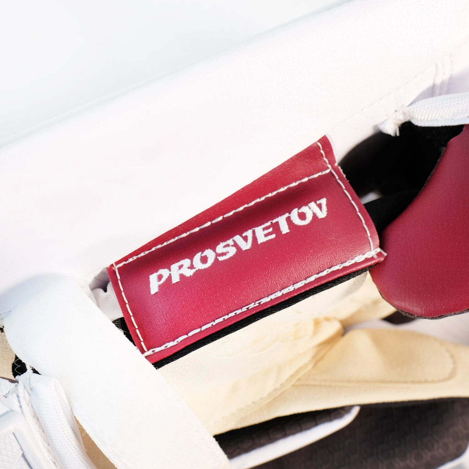 The Prosvetov leg pads are categorized at a level 5 for stiffness (X-stiff), meaning this gear is particularly solid for those who enjoy that tougher feel. Additional elastic and velcro strapping has also been installed, as well as Stabilislide and an Ultrasonic knee block.