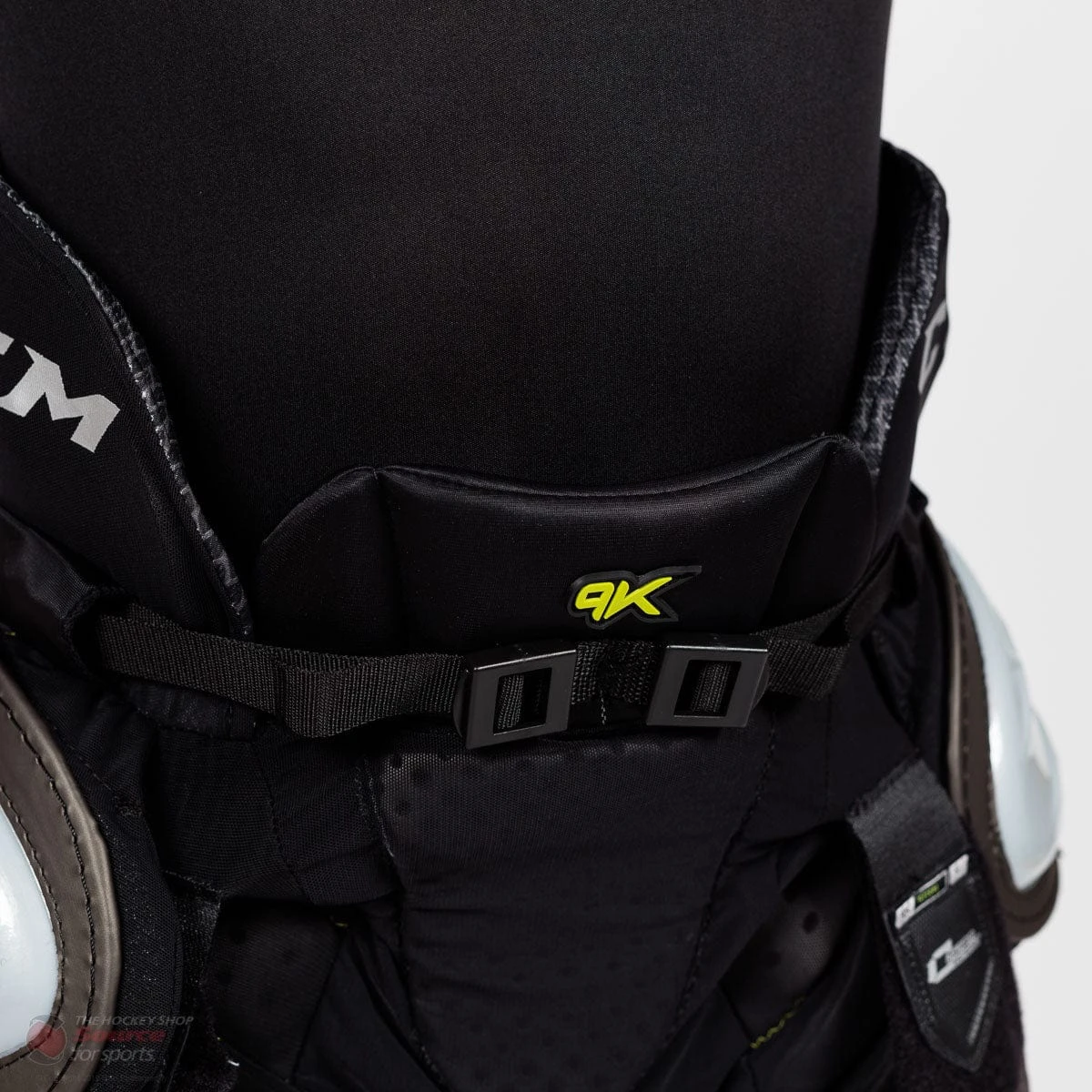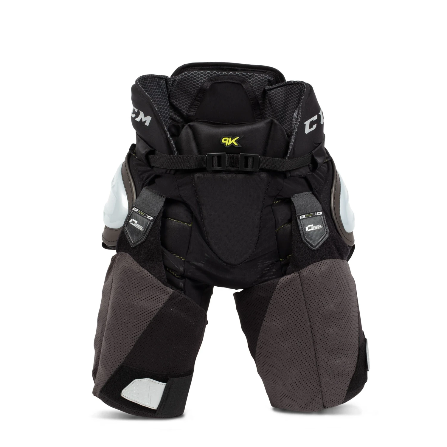 The CCM 9K Pro girdle features pro level protection. The HD foam and PE inserts segmented in the stretch Lycra base offers security in key areas of the body. The free-moving, JDP hip caps float against the hip at all times to better disperse impacts away from the joints. These caps are backed with HD foam as well to absorb more of the impacts. CCM also uses a two-piece Thigh guard backed with added slash protection to wrap around your leg. These pads are fastened with an elastic strap to enable you to adjust the pad tighter or looser around your leg based on your preference.
