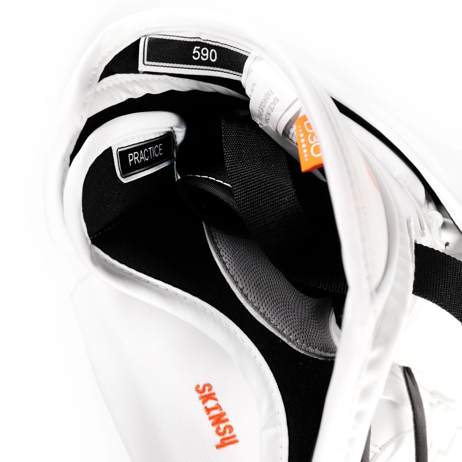 The mainly Jenpro exterior is a popular choice used by many goalies on their gear due to its lightweight feel and durability. The double tee offers greater puck stoppage while the puck enters the pocket of the glove as the extra friction from the laces stop the rotation. Rounding out this pro stock glove is the custom orange “SKINSY” embroidery on the inside of the cuff.Â