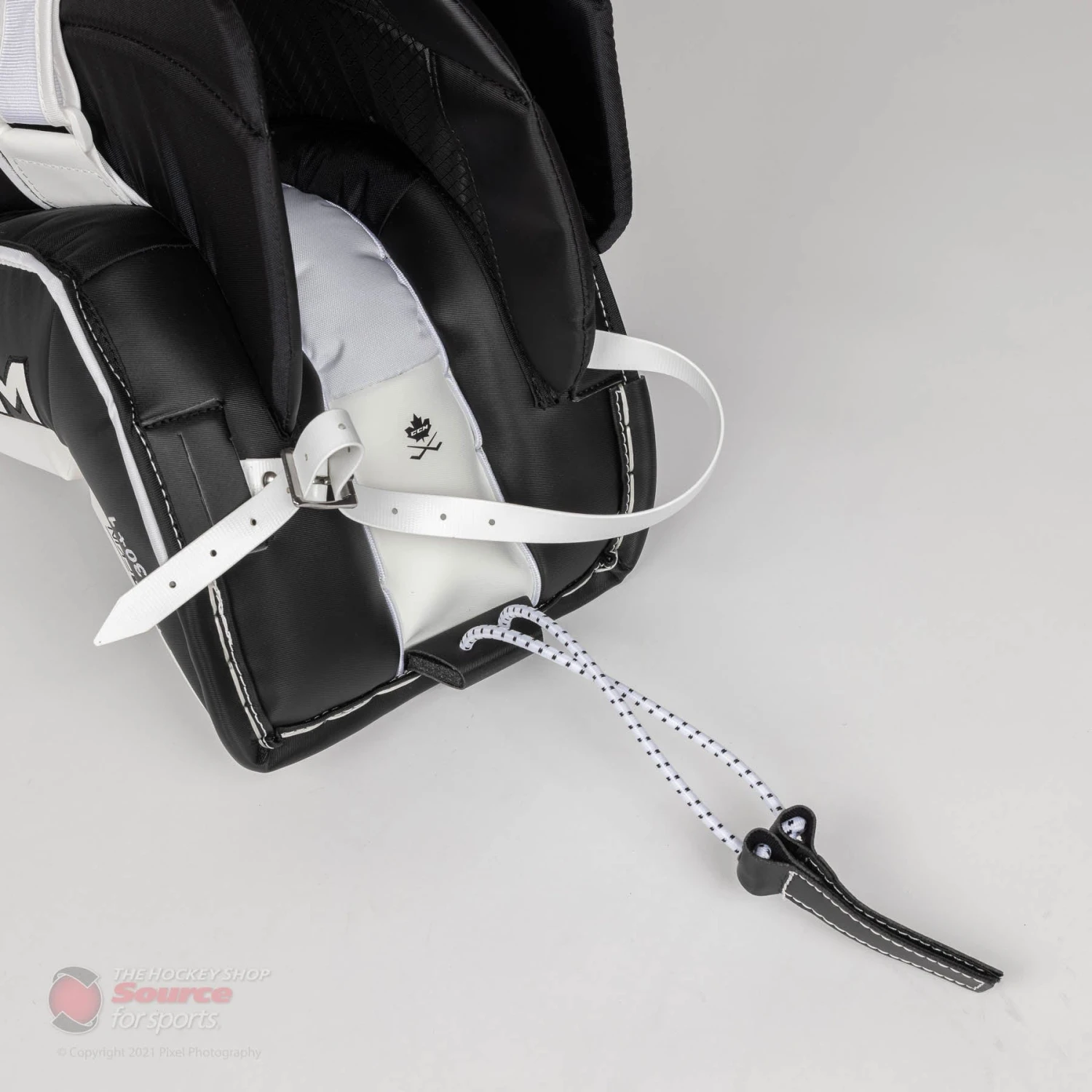 The Source for Sports Exclusive version of the CCM Extreme Flex E5.9 Intermediate Goalie Leg Pads offer a slight variation in color styling from the catalog E5.9 models. Colors offered in the CCM E5.9 Source Exclusive Blocker are; Boston, Chicago, Toronto, All Black, All White, White / Black, and White / Black / Silver. The E5.9 SDC INT Leg Pad is available in 30+1, 31+1, and 32+1.