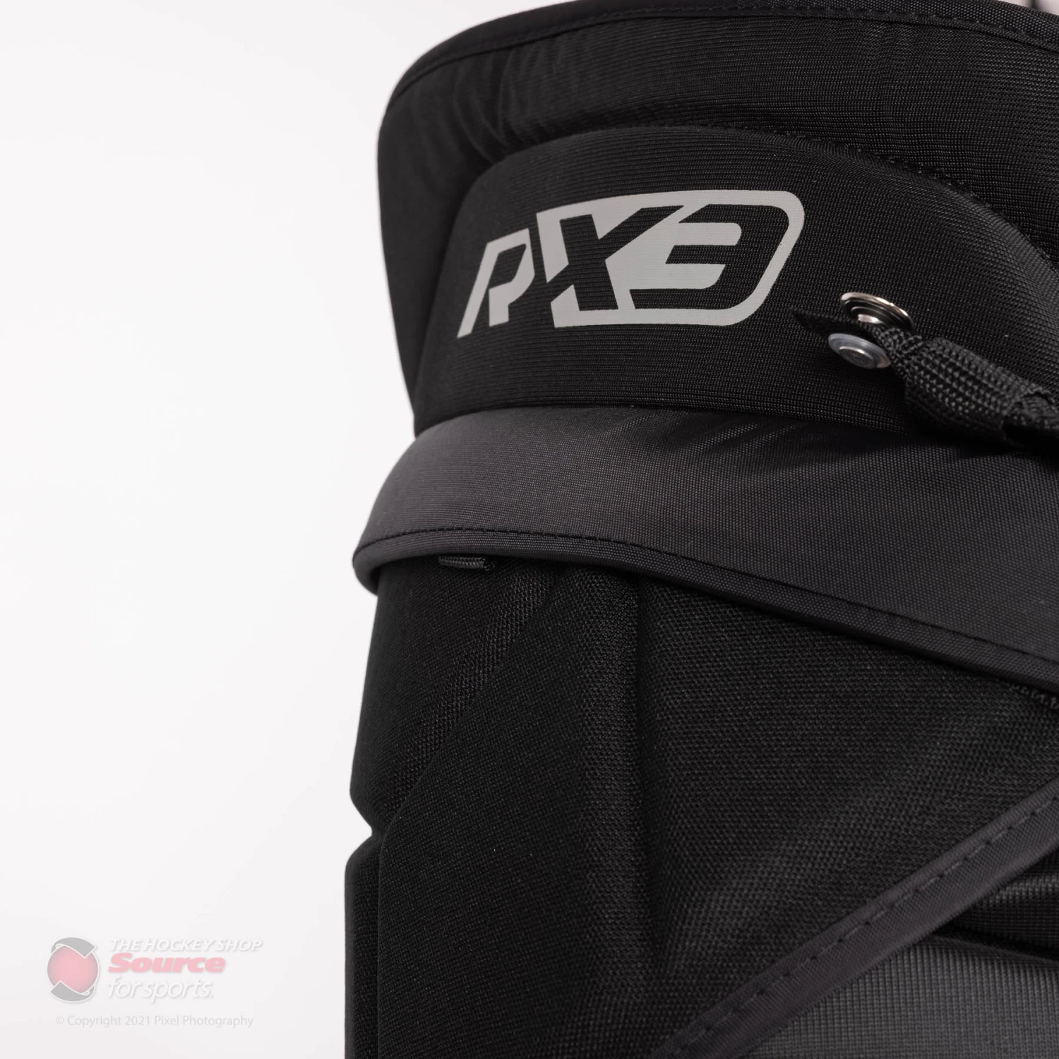 The Warrior Ritual X3 E+ SR Goalie Pants has new redesigned kidney and hip protection. The Warrior X3 E+ goal pants feature HyperComp in the FlexPlates to improve the durability and protection in those areas. The Ritual X3 E+ pants have added AxyCut Design which maximizes the thigh protection, as well as reinforced high wear areas on the pants.